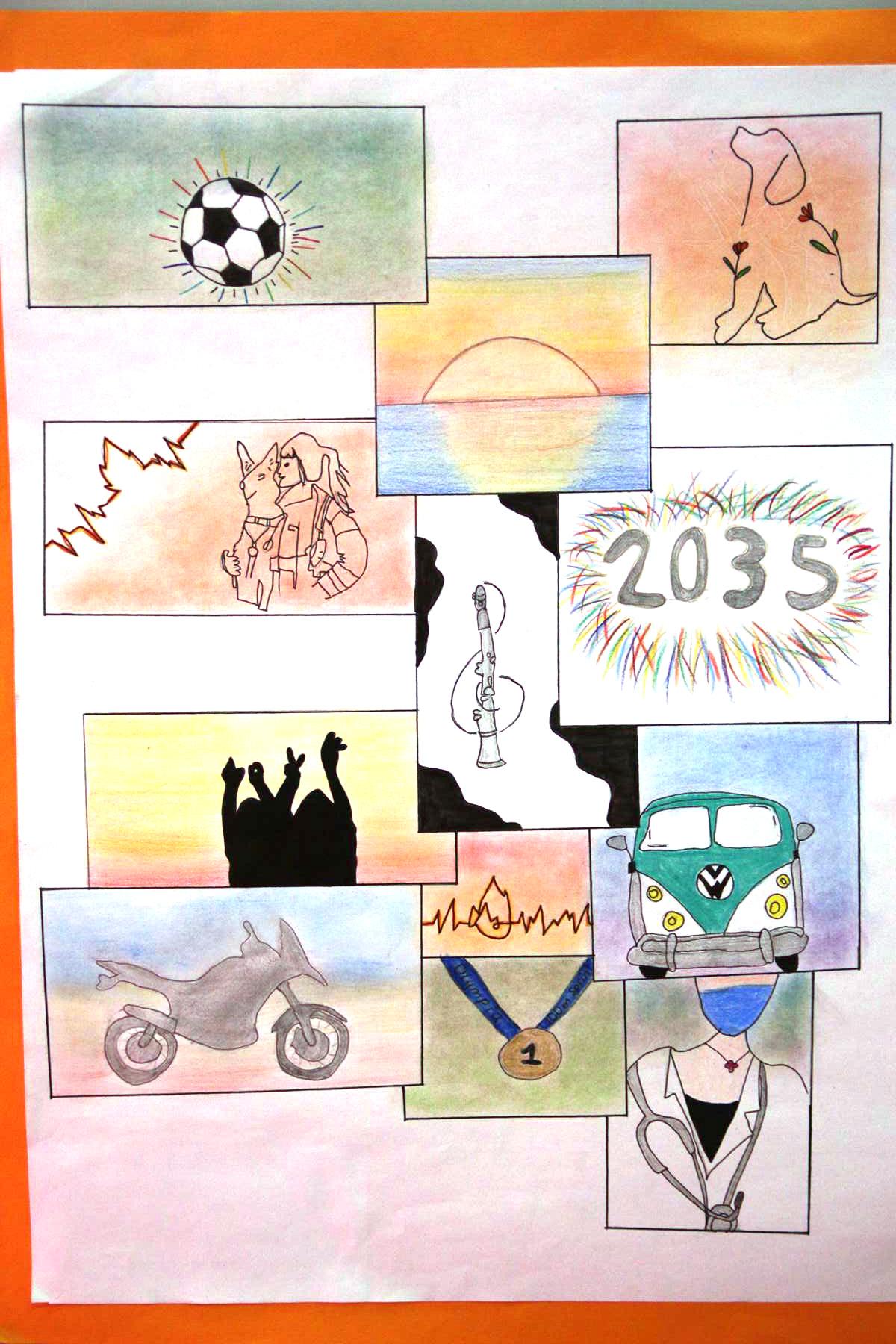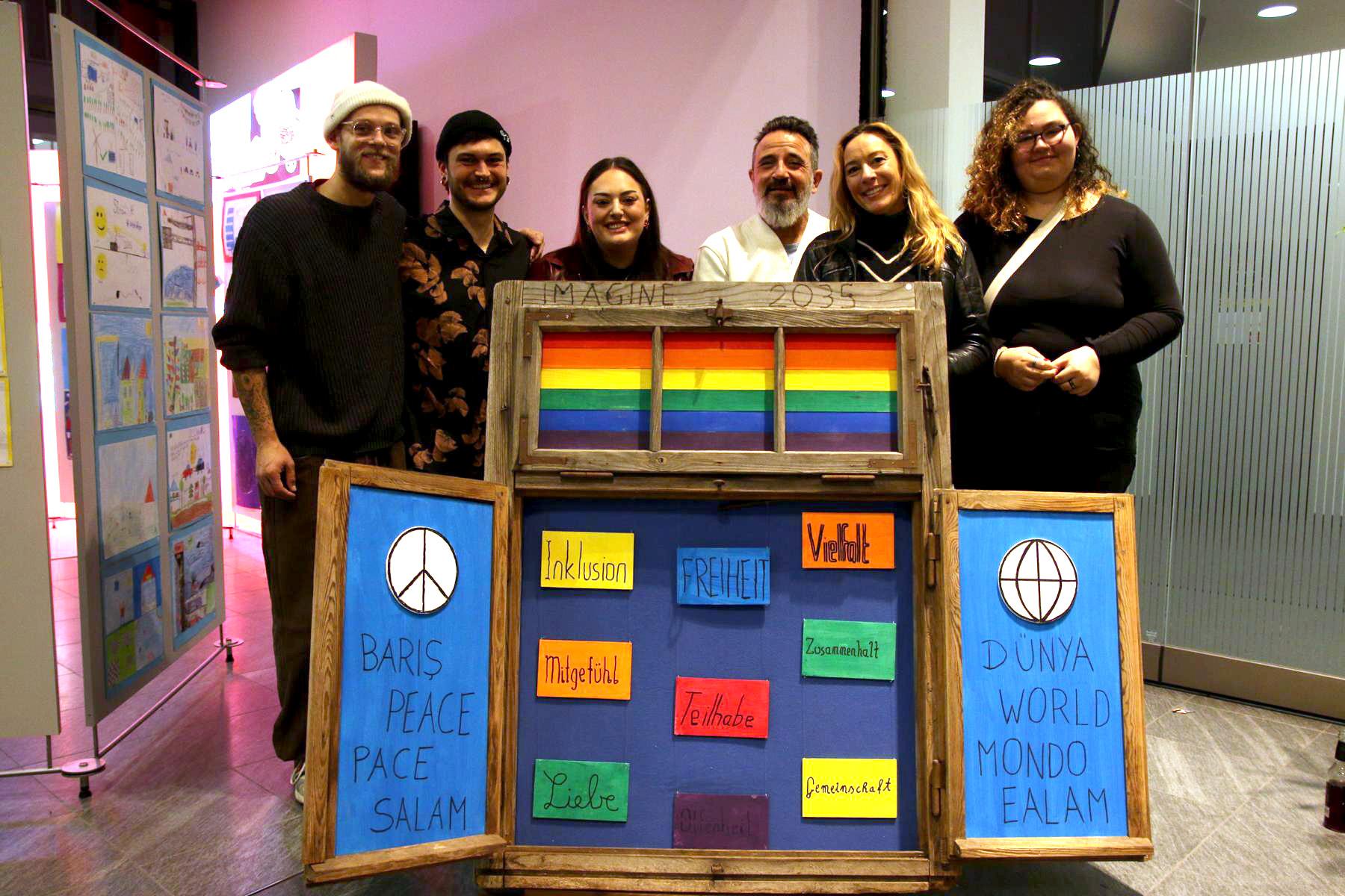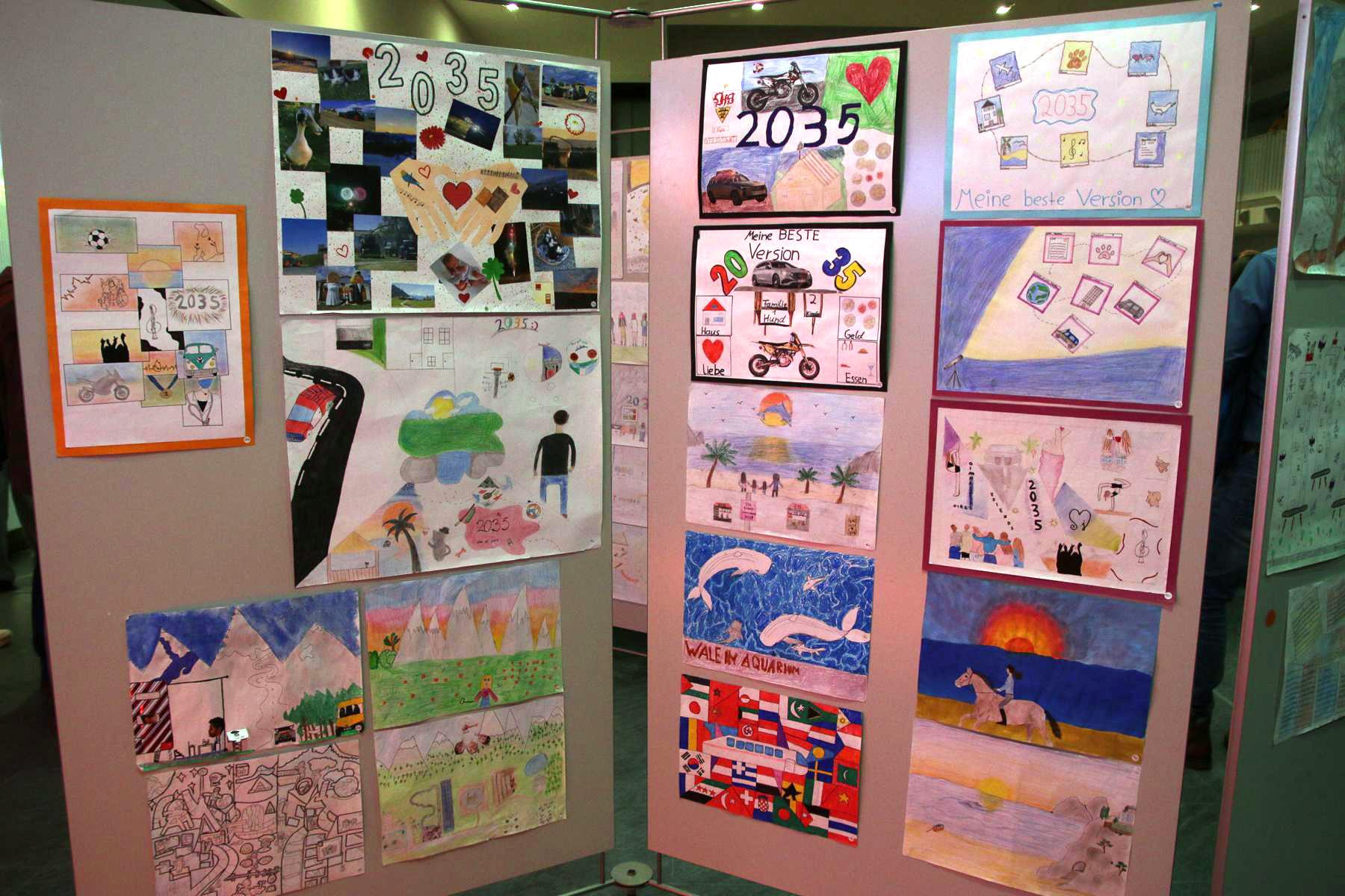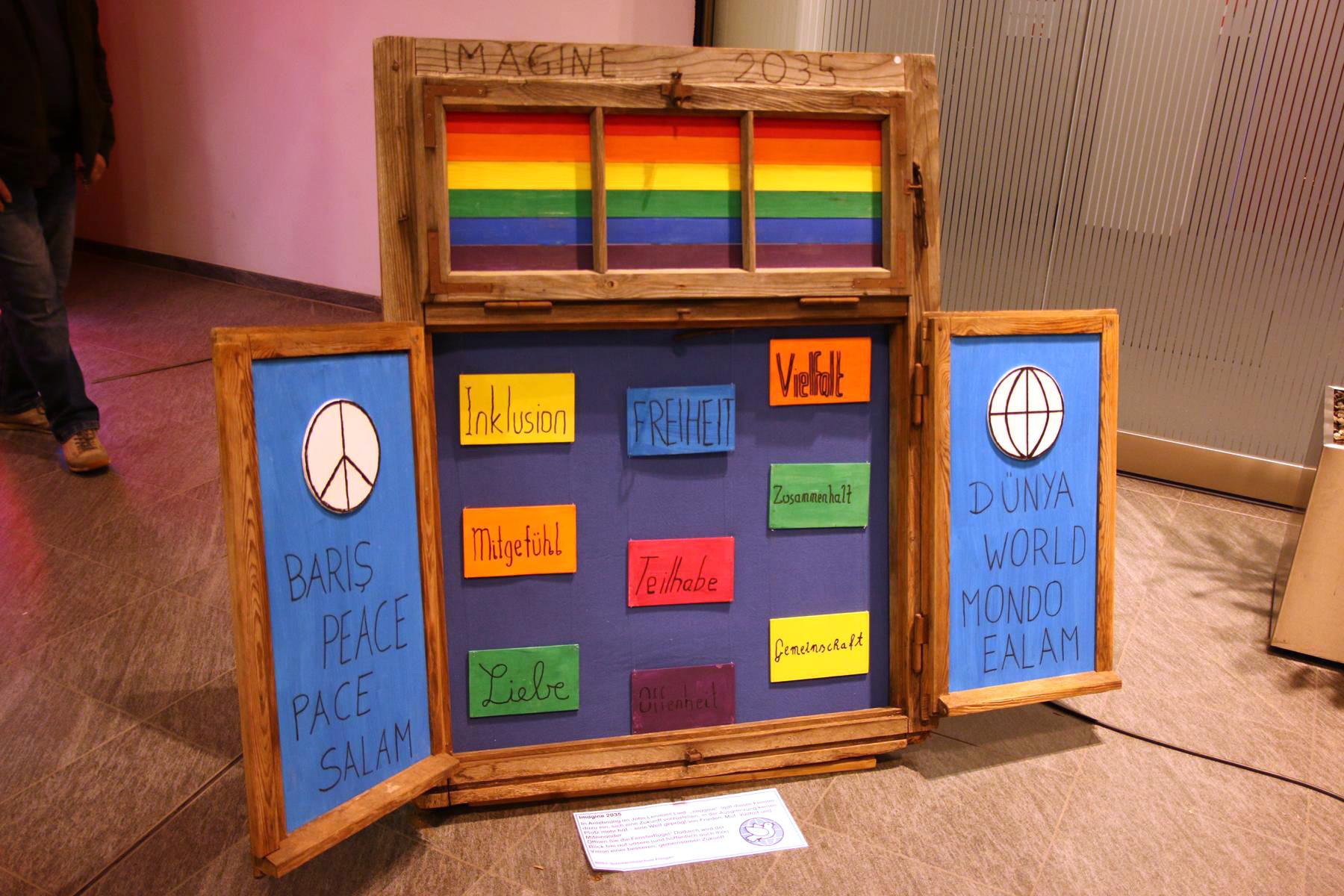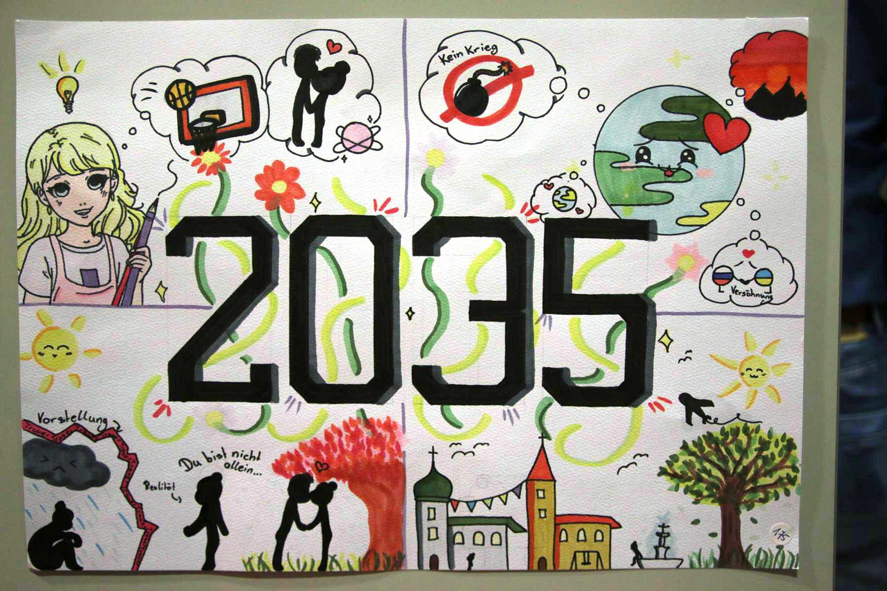 Neben Malereien und Zeichnungen haben die Künstler:innen teils riesige Kunstwerke wie etwa einen Heißluftballon gebastelt. Manche Werke sind in Eigenregie entstanden, andere als Gruppenarbeit oder gar als Klassen- oder Schulprojekt. Das „Imagine-Fenster 2035“ von sechs Schülerinnen der Schmiechtalschule hat die Jury besonders begeistert. Die 15- und 16-Jährigen Mädchen haben ein rustikales Holzfenster so umgestaltet, dass die geschlossenen Fensterläden Begriffe wie „Hass“, „Vorurteil“ und „Ausgrenzung“ zeigen. Sobald die Fensterläden geöffnet werden, kommen hingegen die Werte zum Vorschein, welche sich die Mädchen für die Zukunft wünschen: „Vielfalt“, „Zusammenhalt“, „Gemeinschaft“, „Liebe“ und „Mitgefühl“ sind nur einige davon. Für diese Idee zeichnete die Jury die Gruppe mit dem ersten Platz in der Gesamtwertung aus und überreichte ihnen ein Preisgeld in Höhe von 100 Euro sowie Kinogutscheine.